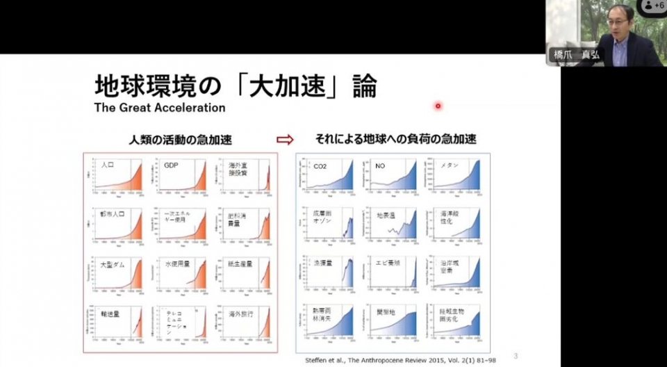 世界人口、経済活動やエネルギー・水の使用量、海外旅行など人類の活動が1950年ごろから急加速しています。それに伴って二酸化炭素や大気汚染物質の排出が増加するなど、地球環境への負荷が急加速しています。これを地球環境の「大加速」論と言います。