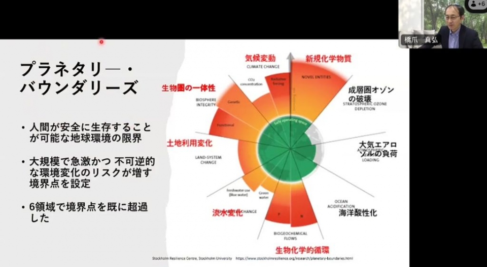 プラネタリーバウンダリーという概念をご存じでしょうか。9領域(気候変動、新規化学物質、成層圏オゾンの破壊、大気エアロゾルの負荷、海洋酸性化、生物化学的循環、淡水の変化、土地利用の変化、生物圏の一体性)が、環境破壊や汚染の進行によって境界点を超えると、元には戻せないという考え方です。昨年、環境科学者たちが評価したところ、すでに図で赤く記した6領域で境界点を超えている状況にあるとのことでした。