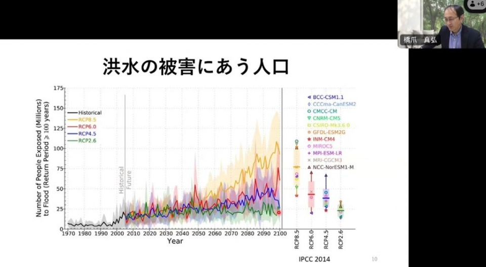 この先、気温が2℃や4℃度上昇すると、豪雨、洪水、熱波などの極端現象(気象災害)の頻度が増加します。特に今世紀中に4℃~5℃上昇するシナリオをたどった場合には、今世紀末に1億人程度が洪水被害に遭う可能性があるとされています。