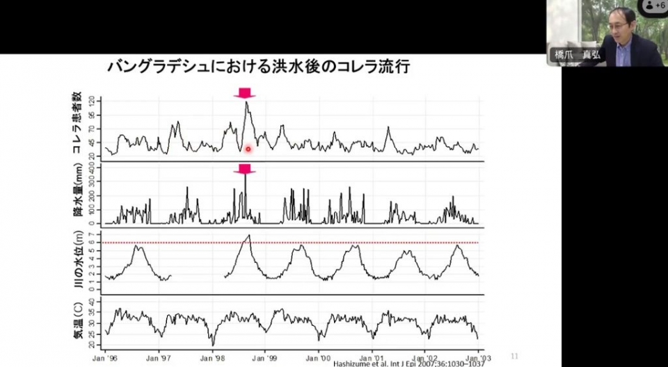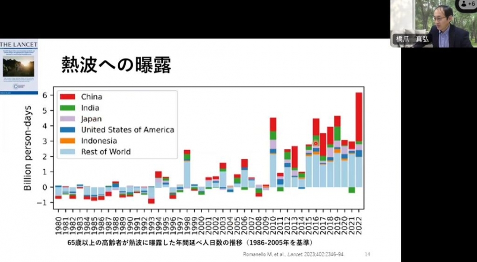 バングラデシュの首都ダッカでは、1998年に洪水で市内の50%以上が浸水し、コレラのアウトブレイクが発生しました。2010年以降、熱波に曝露した高齢者が急増しています。特に多いのが中国やインド、超高齢社会の日本です。