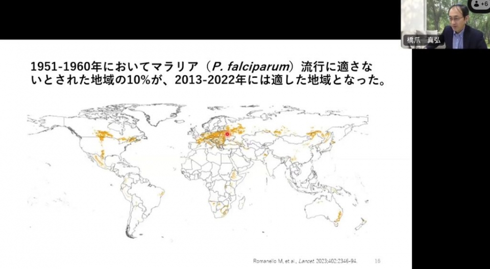 人間以上に気温上昇に敏感なのが生態系です。例えばマラリアを媒介する蚊の生息域が気温上昇とともに拡大すると、熱帯感染症の流行域も拡大します。約70年前にはマラリアの流行に適さなかった地域の約10%で、すでに流行が可能というデータもあります。花粉症も気温上昇によって花粉飛散時期が早まり、飛散期間が長期化する可能性があります。