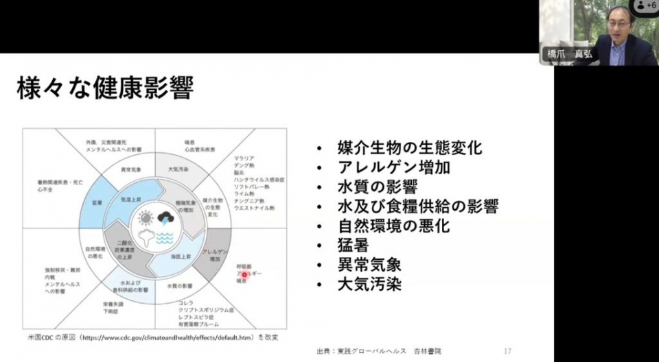 また、降雨パターンが変わって水質が影響を受けると、水を媒介した下痢症などの感染症リスクが上昇します。さらに異常気象によって食料生産に影響が生じて食料価格が高騰し、栄養失調の子どもが増える可能性もあります。その他にも、ある種の大気汚染物質は、気温上昇によって毒性が増すことが報告されていますし、呼吸器疾患や、ある種の心臓血管系疾患リスクが高まる可能性もあります。