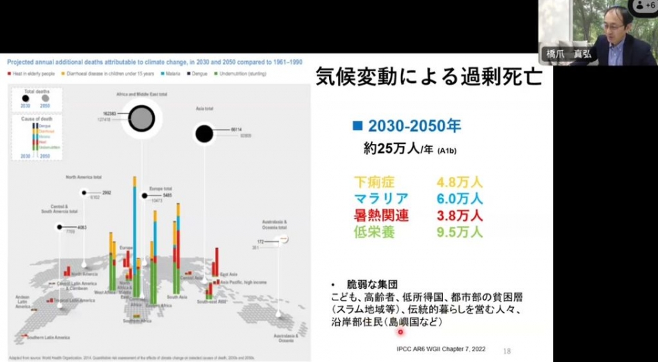 2014年にWHO世界保健機関が発表した、気候変動による過剰死亡の予測推定値によると、2030年から2050年に年間約25万人が過剰に亡くなると予測されています。特にアフリカや南アジアで、低栄養、暑熱関連死亡、マラリア、下痢症などによる過剰死亡が多いと推定されています。