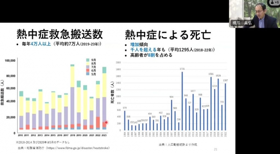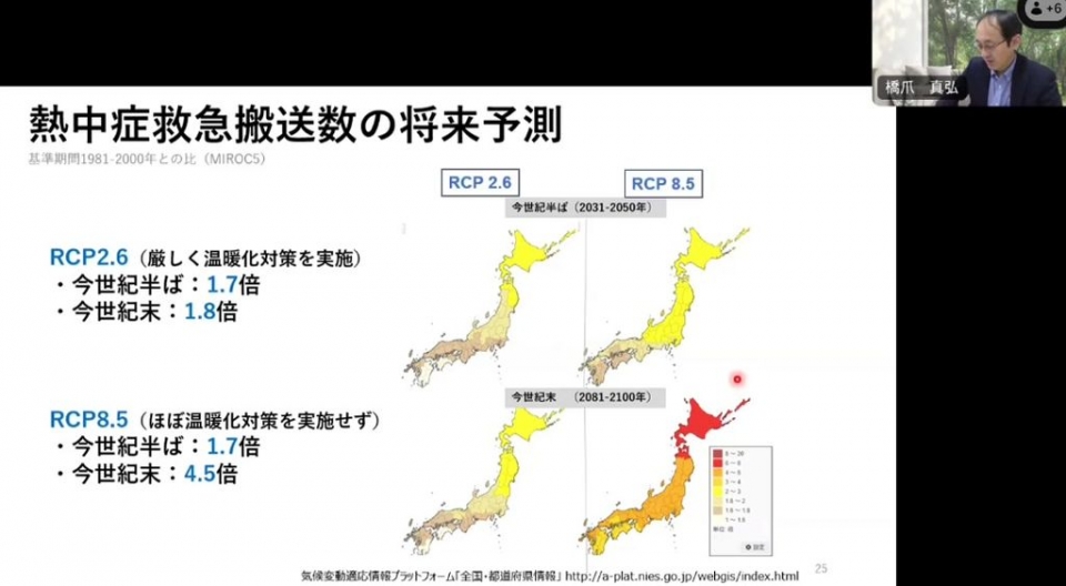 日本では暑熱関連死のリスクが高いと評価されていて、熱中症の死亡者が増加しています。環境省国立環境研究所の気候変動適応情報プラットフォームでは、気候変動によって熱中症の救急搬送数がどのように変化するかを予測しています。2℃上昇シナリオをたどった場合は1980年からの20年間と比べて、今世紀の半ばに1.7倍増加すると予測されています。4~5℃上昇シナリオをたどった場合は、今世紀半ばで1.7倍の増加ですが、今世紀末には4.5倍になると予測されています。