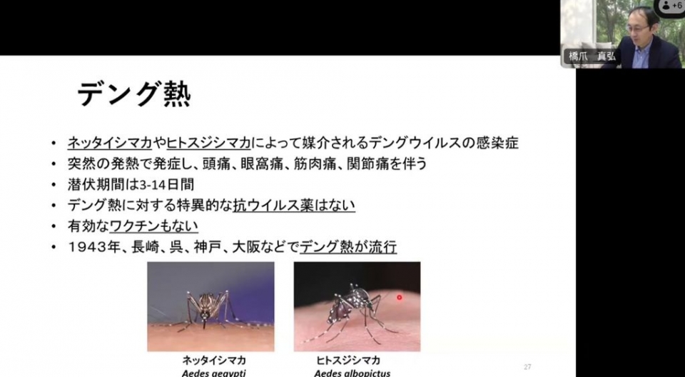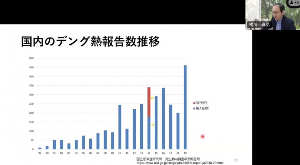 デング熱も懸念されています。リスクのある地域は熱帯地域が中心で、主に都市部や都市近郊で流行する感染症です。日本国内でも輸入症例が急拡大しています。1950年代、デング熱ウイルスを媒介するヒトスジシマカの国内分布可能北限は北関東あたりでしたが、2015年に青森市で幼虫の生息が確認されました。温暖化に伴って生息可能域は広がり、今世紀末には最大で国土の96%に達すると予測されています。このような感染症に加えて、自然災害によって医療機関の被災や医療体制の混乱が生じて、診療ができなくなることも気候変動の間接的な影響といえます。