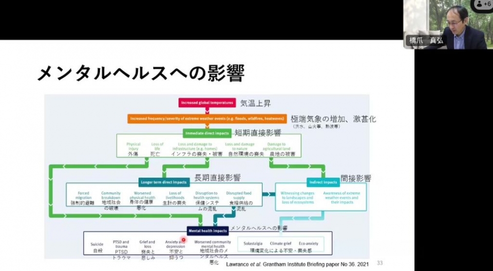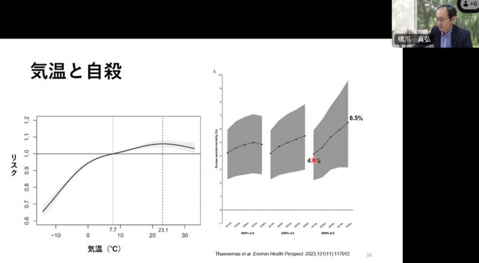 メンタルヘルスの悪化も決して無視できません。災害による一時避難や、地域社会の破壊、医療システムの混乱などによって、ひどい場合は自殺、災害後のトラウマ、不安や抑うつなどが起こることがあり、それらも気候変動の影響と考えられます。メカニズムは明らかになっていないものの、気温が上昇すると自殺のリスクが上昇するというデータもあります。