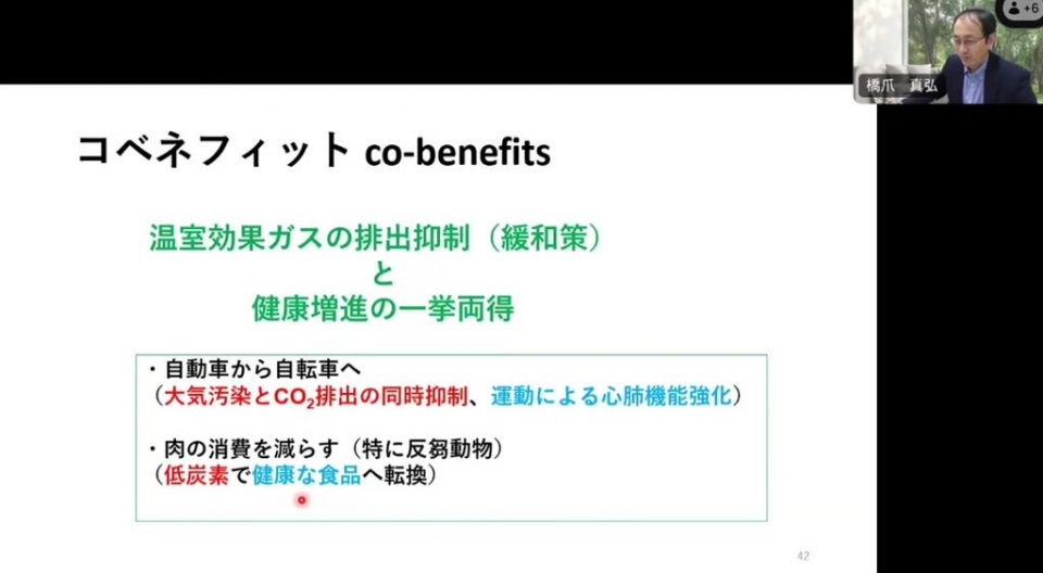 コベネフィットという考えも大切です。これは温室効果ガス排出抑制などの緩和策と、健康増進を一挙両得で進めることです。例えば車から自転車に乗り換えたり、近い距離なら歩いたりすれば、車から排出される大気汚染物質や二酸化炭素の排出が抑制され、同時に運動によって心肺機能が強化されます。
