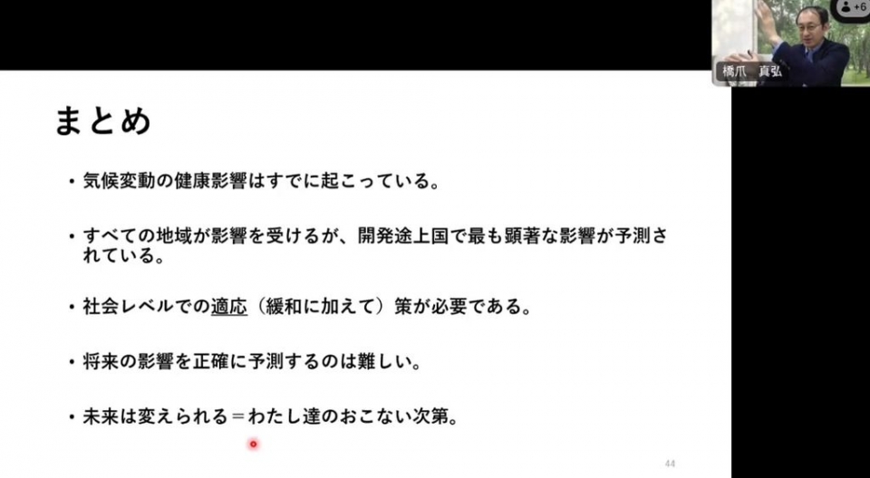昨年10月に世界の200以上の医学雑誌がWHOに対して、新型コロナに伴う緊急事態宣言のように「気候変動および生物多様性緊急事態宣言」を出すことを求めました。一方で私たちの行動や社会のあり様の変化によって、気温上昇の将来的なシナリオが変わってきます。皆さんも今後はコベネフィットのように健康であれば環境にもいいといったことも、ぜひ意識してください。