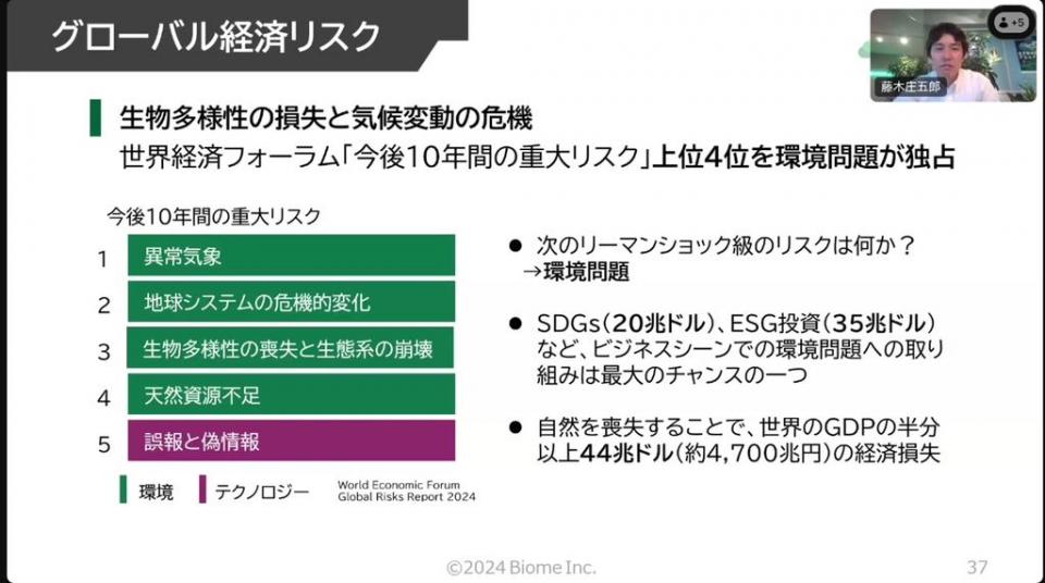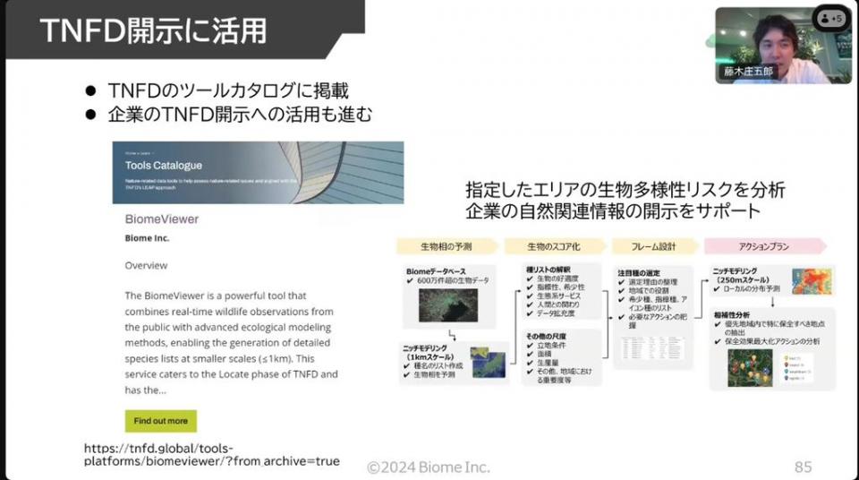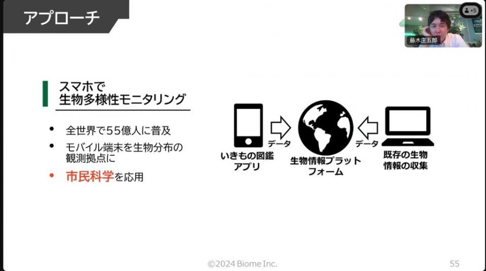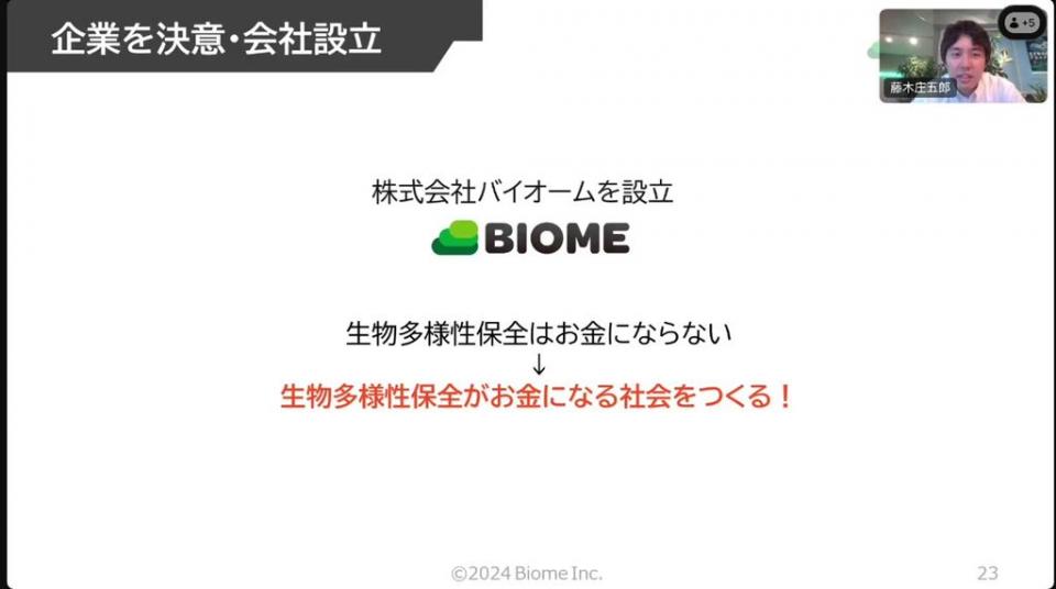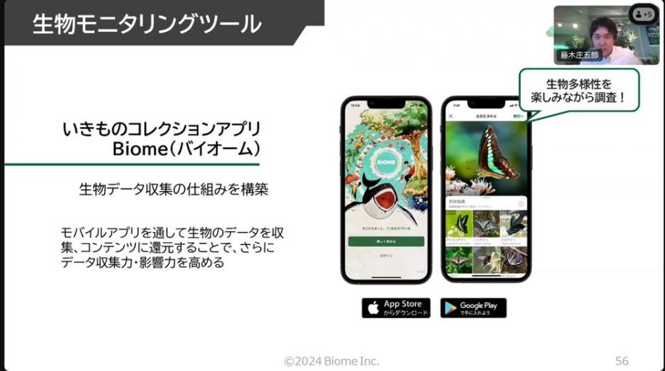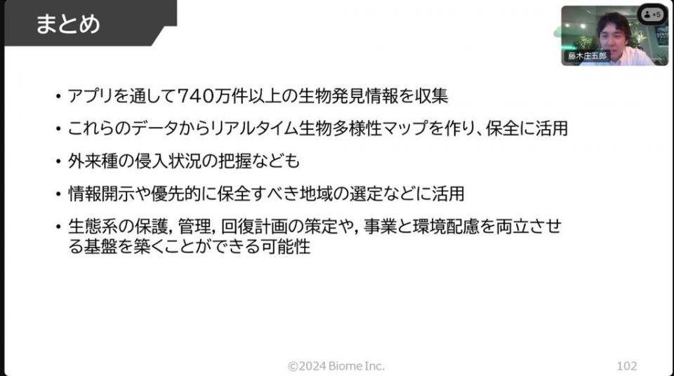 「まだ全然取り組んでいない」という企業様とは今後、保全に資する取り組みにご一緒できればと思いますし、個人の皆様にもぜひ一度「Biome」を使ってみてほしいと思います。楽しみながら使っているうちに保全につながるアプリになっています。いろいろな貢献の仕方があると思いますので、今日をきっかけに、ぜひご自分の行動につなげていただきたいと考えています。