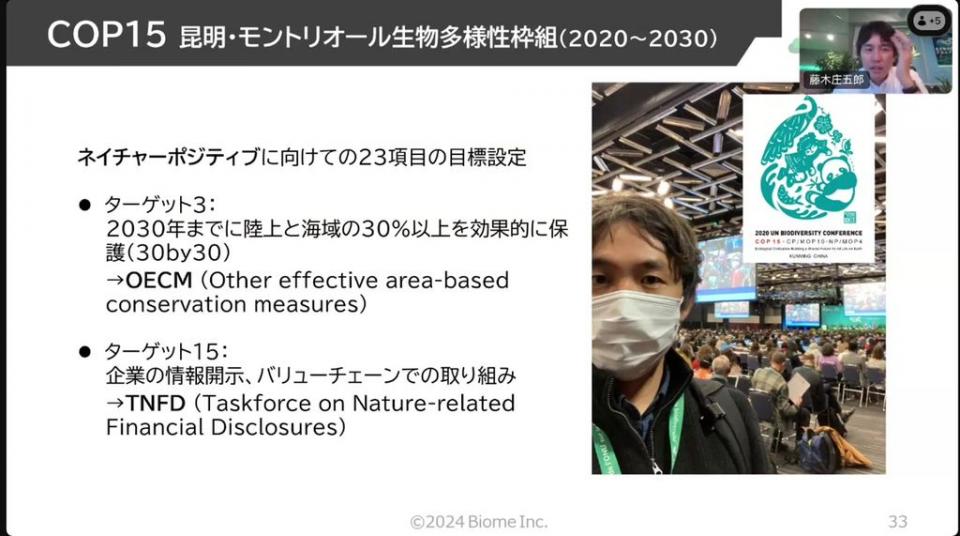 こうした中で2022年の昆明・モントリオール生物多様性枠組(COP15)では「この10年がラストチャンスではないか」ということで、23項目の生物多様性目標が定められました。特に注目度が非常に高いのがターゲット3の「30by30」で、2030年までに陸域・海域30%以上を保護することです。OECM(Other effective area-based conservation measures)という仕組みにより、民間や企業が所有する土地を準保護エリアのような形で保護していく動きが始まっています。同じく注目度の高いターゲット15では、企業の情報開示が努力目標にされました。僕自身がずっと考えてきた、企業や経済と生物多様性の共存のようなものが、求められる社会になりつつあると感じています。
