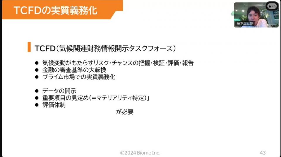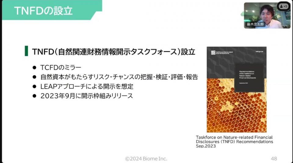 生物多様性の領域でも、天然資源の使用や環境にいいプロセスでの生産などを評価する動きが始まっています。こうした中でTNFD(自然関連財務情報開示タスクフォース) の正式版がリリースされ、企業はそれに従って開示をする必要性が高まってきました。すでに株価への影響も出始めているようです。