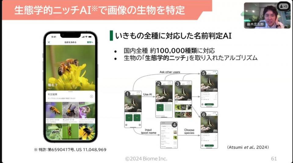 そしてみんなで生物の写真をシェアしながら、楽しくゲーム感覚で生き物探しができる体験を通じて、生物のデータが集められるスマートフォン用アプリ「Biome(バイオーム)」の開発に取り組んできました。また、誰でも参加できるようにしたいと考え、国内のほぼ全生物である約10万種の名前を、画像からAIで特定する仕組みを組み込みました。