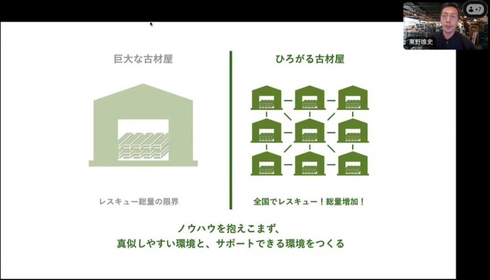 東野そうですね。古材はニーズとのバランスのようなものはまだ難しく、レスキューする量が使われるよりも多い状況なので、消費の量をいかに増やすかをもっと考えないといいけない状態です。