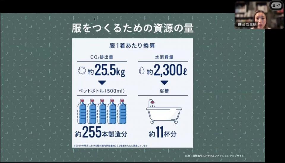 現在、日本で売られている洋服の98.5%は国外で作られています。コットンの栽培段階から考えると数カ国を移動していることも多いので、なかなか服ができる過程での問題が見えにくい現状があります。たとえば服を1着作るのに、ペットボトル255本を作るのと同じぐらいのCO2を排出することや、コットンの栽培や染色に不可欠な水は、1着当たり2,300ℓぐらいということなどです。また、短い納期で洋服の裁縫を間に合わせるために多くのミシンを置いたことや、無理な増築、建物の補強不足などで工場が倒壊し、多くの方が亡くなる事故が起きたこともあります。