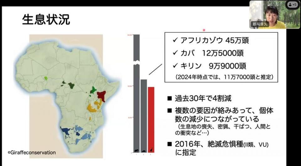 キリンはアフリカにだけ生息する偶蹄(ぐうてい)目(2組の偶数のひづめをもつ動物)というグループの1種で、哺乳類の仲間です。野生のキリンの生息状況はあまり良い状況とはいえません。2015年~16年ごろに行われた大規模な調査の結果、推定個体数は9万頭前後で、密猟や人による排除、生息域の減少などによって、過去30年間で4割ぐらい減っていることが発覚しました。そこで2016年に絶滅危惧種に指定されて保護活動が本格化しました。2024年時点で12万頭弱ぐらいまで増加しつつあります。