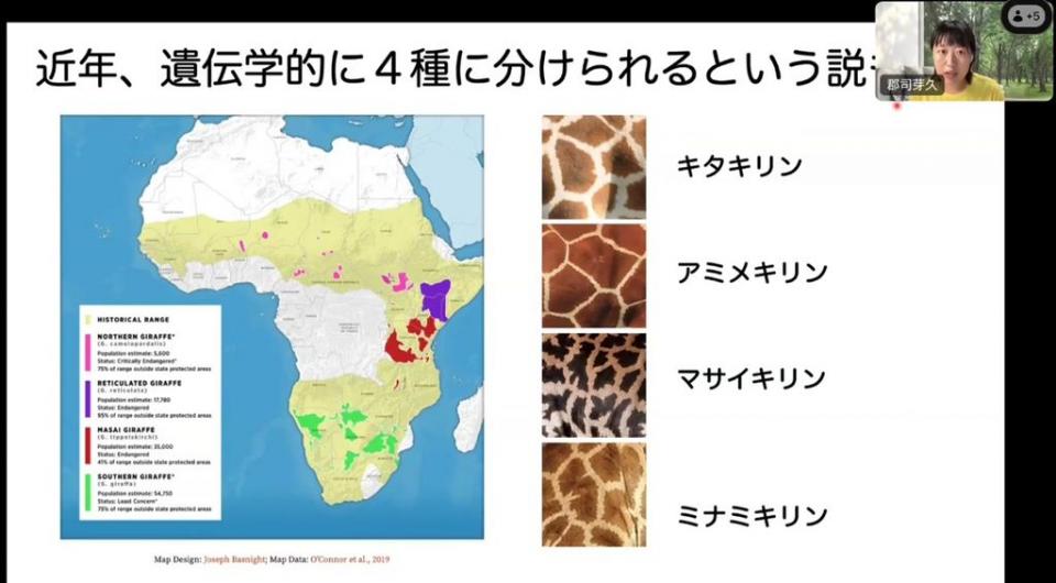 キリンは長い間、1種類と考えられてきましたが、近年は遺伝学的にキタキリン、アミメキリン、マサイキリン、ミナミキリンの4種類に分けられるという仮説が立てられています。この仮説で大事な点は、各グループの生息地に合わせて、人間側が保護をしていかなければいけないことです。