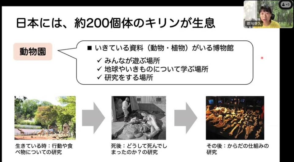 国内の動物園では、200頭ほどのキリンが飼育されています。博物館法という法律の中では、動物園は博物館の一種とされていて、研究活動も行っています。その一つが生きている時の研究で、行動、食べ物、繁殖に関する研究などが行われています。死亡した場合は、病気やけがなどの死因や、効果的な治療方法を研究しています。また、死因解剖後に近隣の博物館や大学が検体として受け取り、私のような研究者が解剖して、体の仕組みを研究したり、骨格標本として展示に活用したりしています。