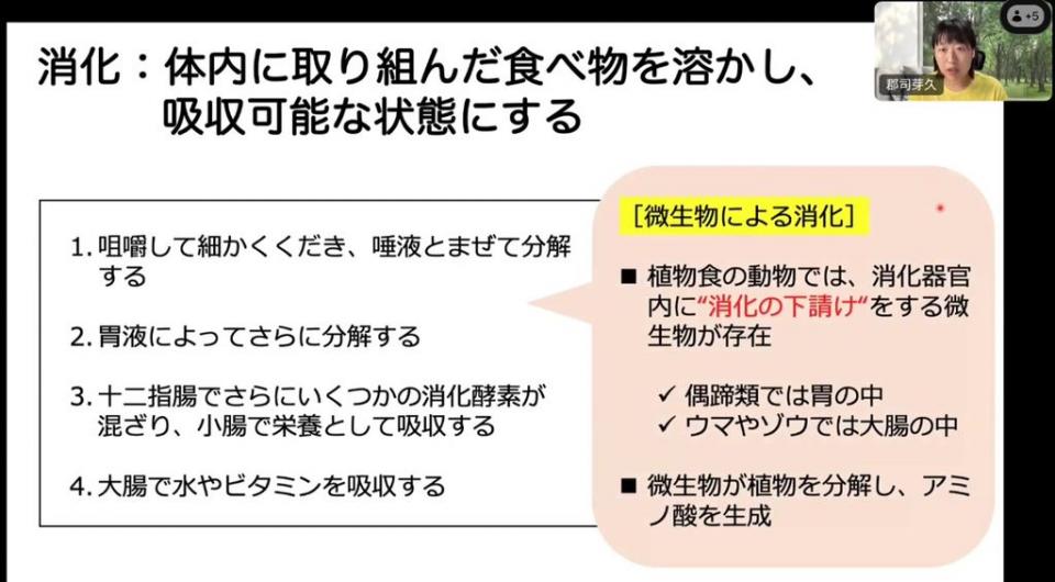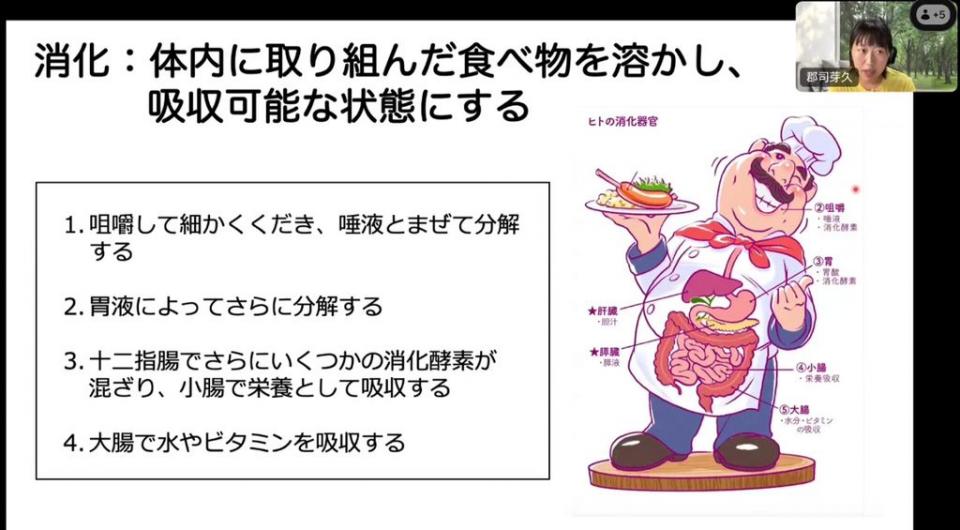 次に消化に注目したお話をします。哺乳類はまず、食べたものを口の中で咀嚼(そしゃく)します。胃の中で胃液と混ぜて、消化液によってさらに溶かします。次に十二指腸でいくつかの消化酵素と混ぜ合わせて、より細かく溶かします。最終的には小腸で栄養を、大腸で水分やビタミンを吸収し、残りカスが排せつされる流れです。