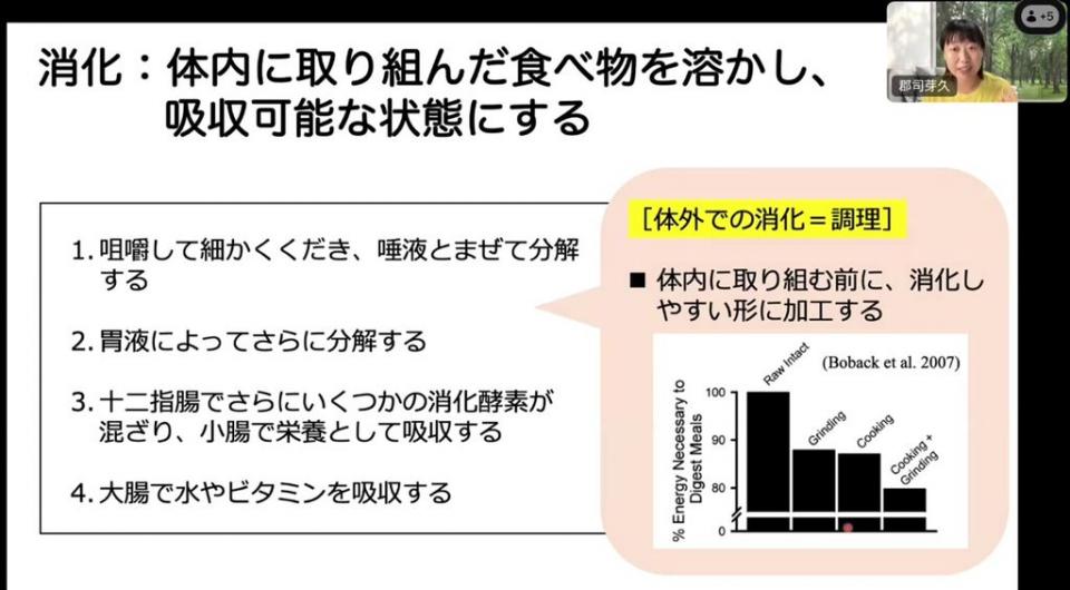 ちなみに人間にも特有の消化ステップが存在します。体外での消化といわれる「調理」です。包丁で小さく切る、加熱して柔らかくするなど、体内に取り組む前に消化しやすい形に加工しているのです。人類の進化上では、火を使えるようになったことが一つのターニングポイントといわれます。加熱調理することにより消化で消費するエネルギーをかなり節約できたことで活動範囲が広がり、エネルギーをすごく使う脳が発達できたといわれているのです。