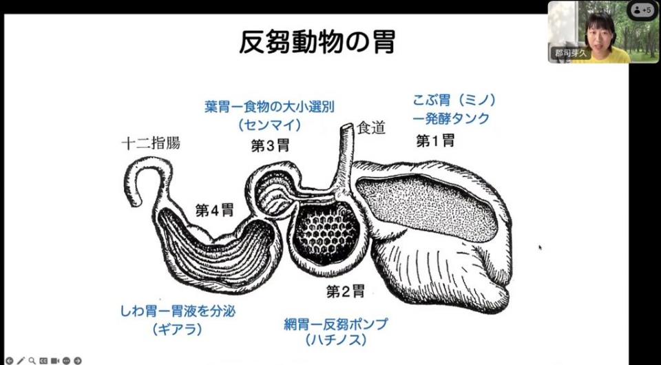 キリンに話を戻しますが、キリンの消化には反芻という大きな特徴がありますが、反芻動物の胃は4部屋に分かれています。最初に食べ物が入る場所がホルモン屋さんでミノと呼ばれる「こぶ胃」で、そこに微生物が生息しています。「ハチノス」と呼ばれる2番目の胃は、もう少し咀嚼が必要なものを吐き戻す時に入る胃です。「センマイ」と呼ばれる3番目の胃では、消化に回せるものと、反芻するものを選別します。そして「ギアラ」と呼ばれる4番目の胃だけが消化液を出します。こうして食べたものの繊維が見えなくなるほど細かくすりつぶされ、無駄なく栄養が吸収されていると考えられています。
