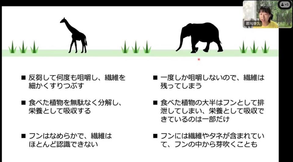 一方でウマやゾウの仲間は、反芻をしないので、食べたものの一部しか栄養として吸収できません。消化できなかったものはウンチとして排せつしています。ウンチには未消化な種などが入っているので、移動した先でいっぱいウンチをすると、種から新たな命が芽生えて次世代の森につながっていくこともあります。広い視点で見てサステナブルな消化システムといえるかもしれません。