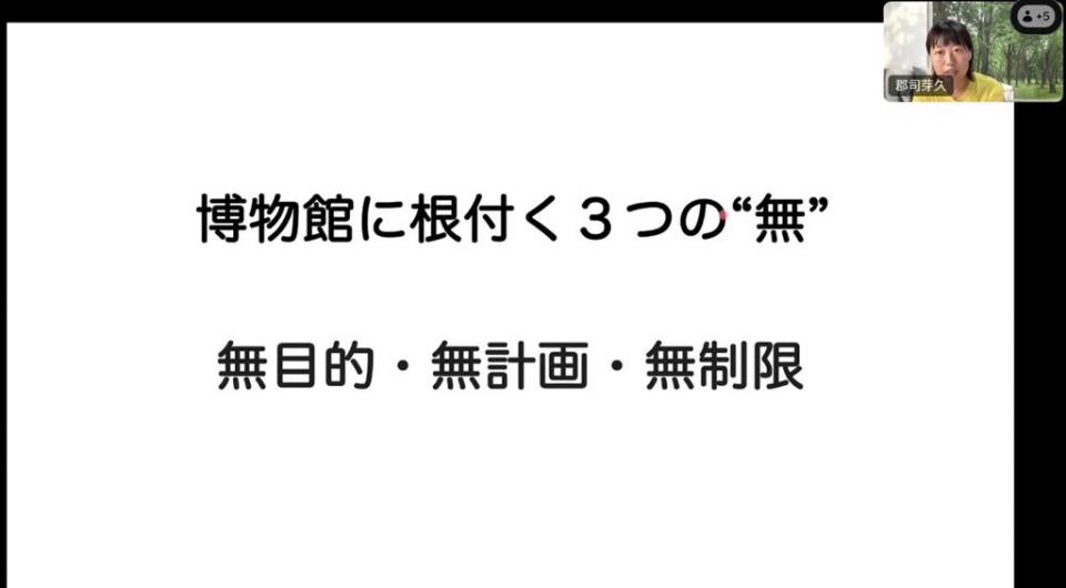 最後に博物館に根付く3つの“無”という話をします。3つの“無”とは、無目的、無計画、無制限です。博物館の大きな役割は、さまざまなものを集めて保管し、未来につなげていくことですが、現時点での価値基準で集める標本を制限してしまうと、未来に役に立つコレクションができません。これが3つの“無”が大切な理由です。