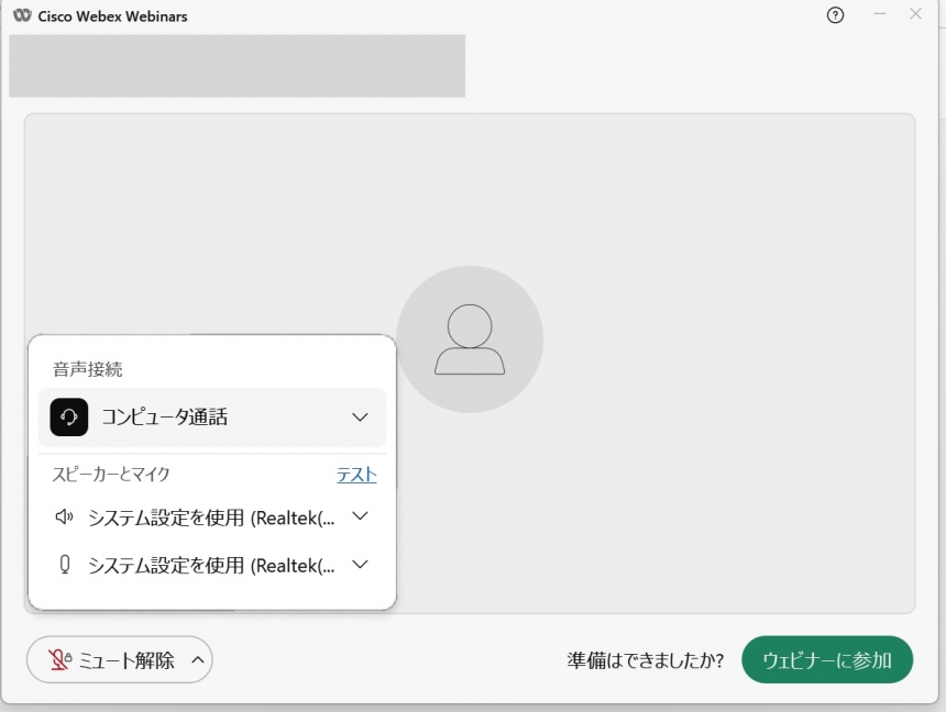 Cisco Webexアプリが立ち上がりますので、音声が出るか画面指示に従いテストしてください。※マイクは使用不可となっておりますので、マイクのミュートは解除できません。