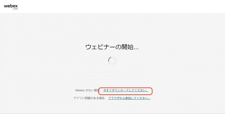 Webexアプリがインストールされていない場合、ダウンロード/インストールのリンクが画面下に表示されますので、「今すぐダウンロードしてください」をクリックして、ダウンロード・インストールされます。以下のボタンからもダウンロードいただけます。