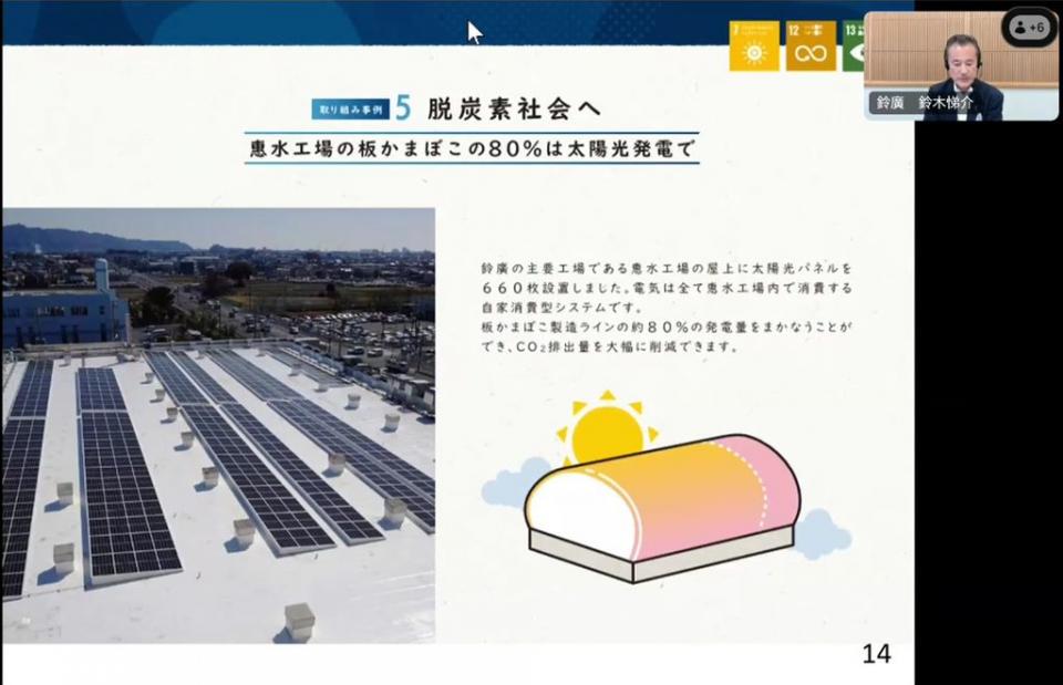 かまぼこは、冷蔵あるいは冷凍した原料を使って、調理をして熱をかけてまた冷ますといった具合に、かなりエネルギーを使います。現在、板かまぼこの製造ラインでは、その電力の約80%を工場の屋根に設置した太陽光発電でまかなっています。