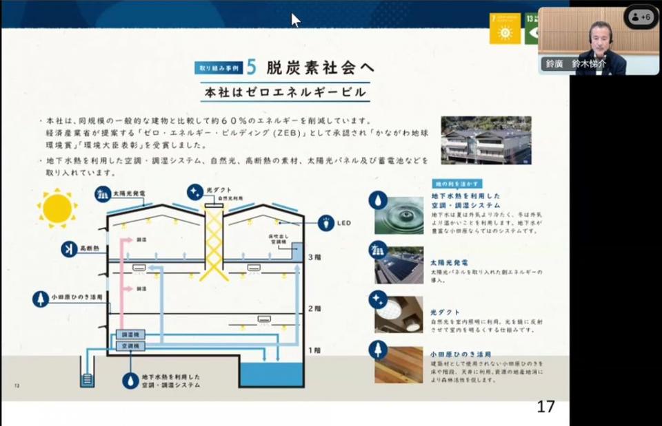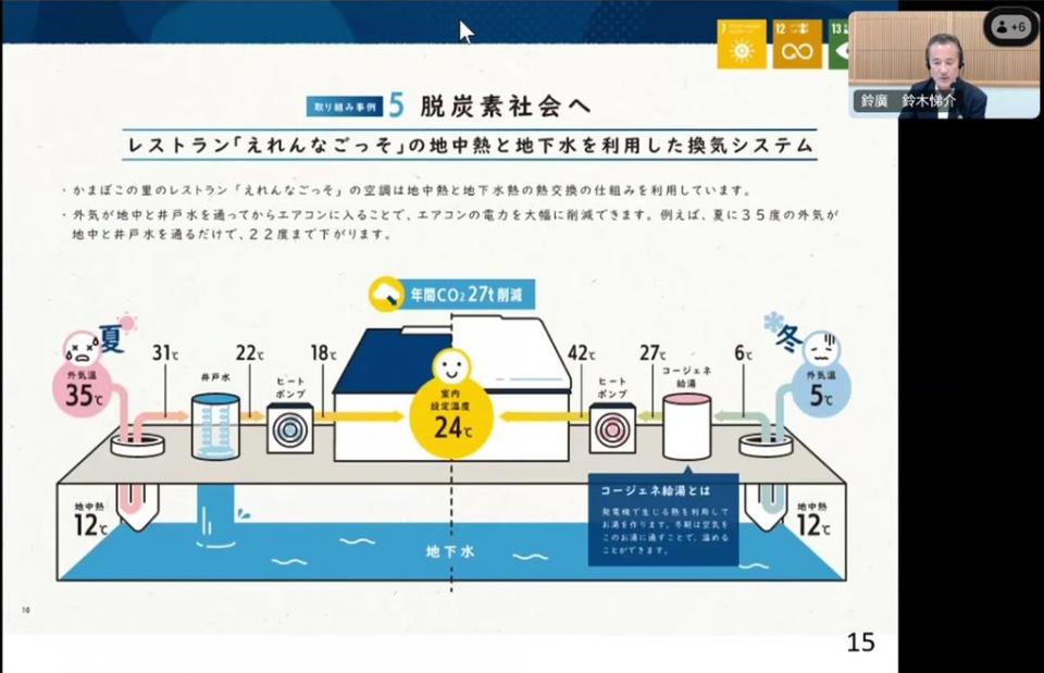 本社ビルは普通のビル比で約4割のエネルギーで動いています。自家用の太陽光発電、光ダクトにより太陽光を直接取り入れる照明、井戸水による空調などを利用しています。最も効率的なのが1年中15℃~16℃程度の井戸水利用です。夏の外気温が35℃の日、外気を井戸水に通すと25℃ぐらいに下がるので、電気で2、3℃下げれば涼しい風が吹きます。冬は0℃の外気を井戸水に通すと5℃ほど上がるので、電気で少し暖めています。井戸水を汚すことはないので、二次利用しています。このしくみは工場でも採用しています。