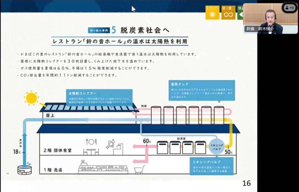 レストランでは地中熱も使っています。また、屋根上の太陽熱温水器で、大量のお湯を沸かしています。このようにいろいろなことを組み合わせて使用するエネルギーを減らしつつ、できるだけ環境負荷の少ないものに切り替えていこうとしています。