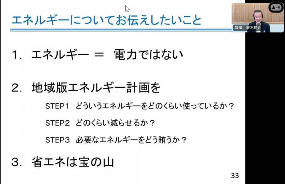 二つ目は地域版エネルギー計画を策定する大切さです。国のエネルギー基本計画は経産省が中心になってつくっていますが、地域によって自然環境も産業構造も人口構成も違うので、すべての地域に当てはまるわけではありません。各地域が未来に向けてどのようなエネルギーを使い、どういう地域をつくるかは、自分たちで考えるべきと思うのです。そして行政に政策として落とし込んでもらうことが大切と考えています。