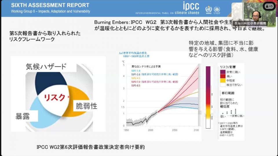 将来予測シナリオに応じたリスク評価を行った結果として、特に食料、水、健康などの人々のウェルビーイングに関わるリスクが広がりつつあり、地域によって不公平が発生していることが分かっています。平均気温2℃上昇を境目に、リスクが大きく広がることも明らかになっています。