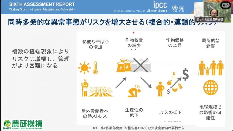 第6次報告書では、リスクが複合的かつ連鎖的ということも示されています。例えば熱波や干ばつなどの増加は作物収穫量の減少のみならず、労働者の健康や生産性の低下、コストや人件費の増加、価格の上昇につながるとされています。このように最初は局所的でも、連鎖しながら地球規模で影響を及ぼす可能性があるのです。
