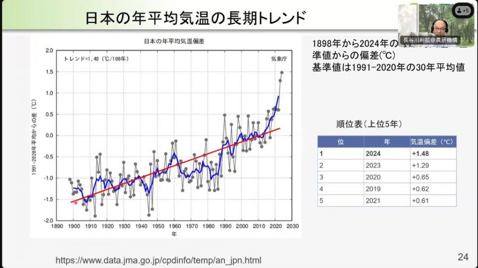 日本では、過去100年間で平均気温が約1.4℃上昇しています。令和6年は、平年値に対して+1.48℃も高い過去最高の高温を記録しました。また、記憶に新しい令和5年は、「60年に1回の猛暑」と言われる程の暑さでした。IPCCが予測するように、温暖化の進行に伴い、猛暑の頻度・程度は増加します。近年頻発する猛暑についても、温暖化の影響があると言われています。