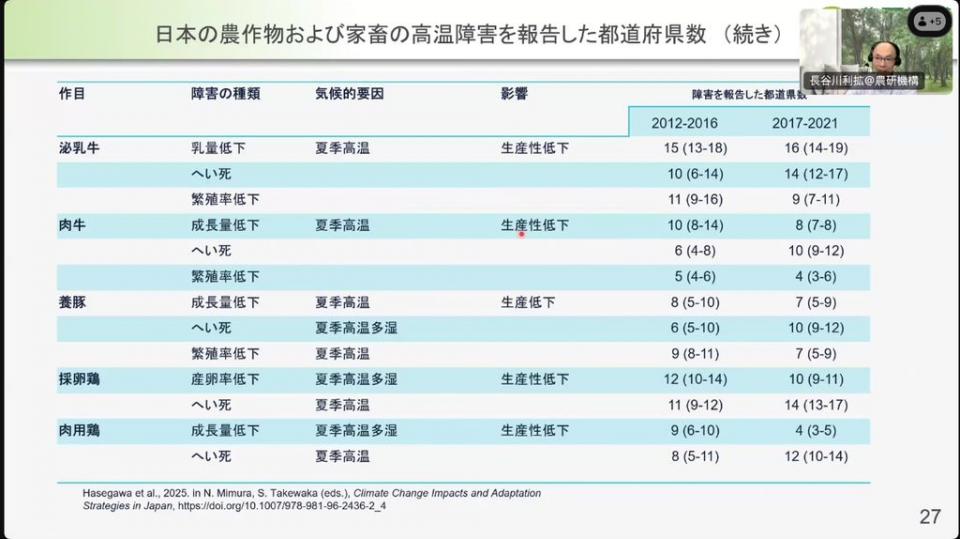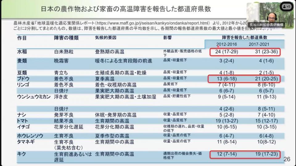 国内の農業では、多くの品目で負の影響が報告され、影響も拡大しています。果樹ではブドウの着色不良などの影響が、畜産では乳牛、肉牛、養豚、採卵鶏、肉用鶏などで死に至るような影響が広がっています。また、花卉では出荷時期の狂い(生育前進あるいは遅延)などが報告されています。