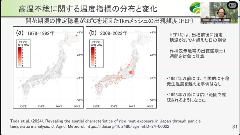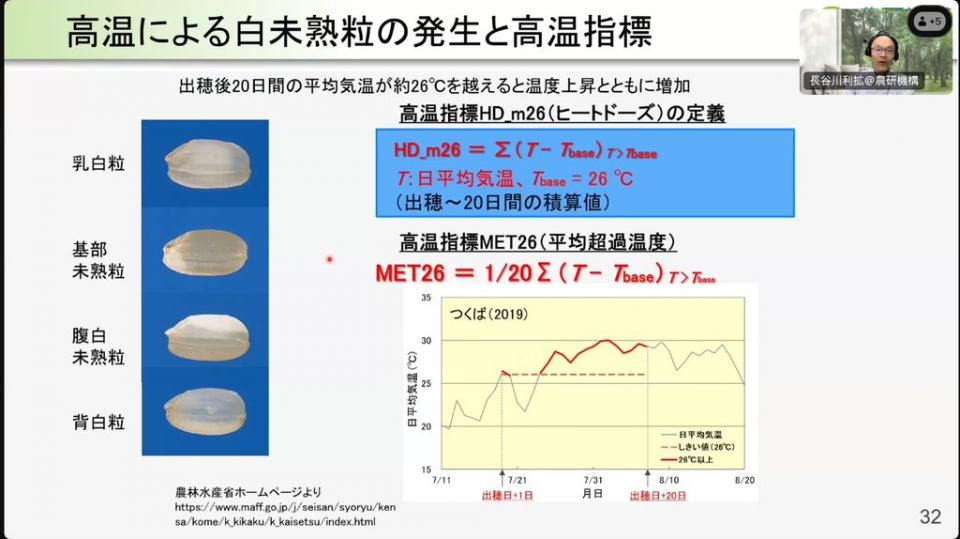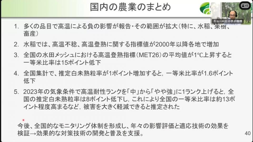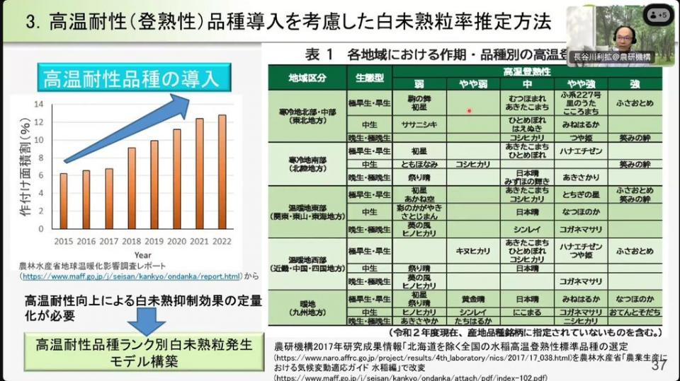ただし、これらに対する対応策として、高温でも白未熟粒が出にくい高温耐性の品種を導入することで、被害をかなり軽減できるということも分かってきているので、そのような技術展開を急いでいるところです。