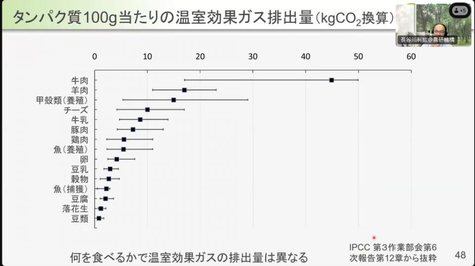 第6次報告書では、私たちが何を食べるかによっても、温室効果ガスの排出量が大きく異なることが報告されています。例えば、同じタンパク質100gを摂取する場合でも、肉を食べると植物中心の食事に比べて多くの温室効果が排出されることが分かっています。ただしヨーロッパの研究では、肉食の割合を週1回減らすだけでも、温暖化削減には大きな効果があるとされています。つまり、完全に菜食主義に変えるといった極端な食生活の変化をしなくても、一定の効果が期待できるということです。また、肉の生産方法や魚の養殖方法、その場所によっても、温室効果ガスの排出量は大きな差があります。そういった意味では、食べるものがどこから来たか、どのようにつくられたか、どのような影響があるのかということを、考えることが非常に重要です。