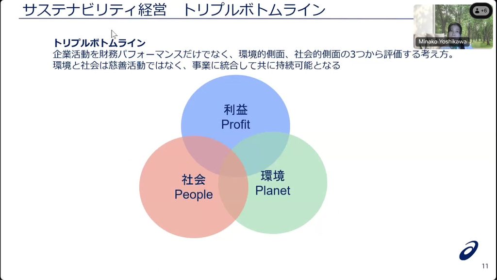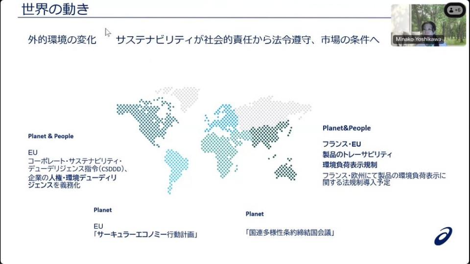 アシックスは、スポーツを通じた人々の心身の健康が将来世代に渡って実現するよう、気候変動を重要課題と位置づけて取り組んでいます。2050年温室効果ガス排出量実質ゼロに向けて脱炭素および循環型ビジネスモデルへの転換を目指し、温室効果ガス排出量の低いスニーカーやリサイクルできるランニングシューズを開発した、アシックスのサステナビリティ戦略についてお話いたします。