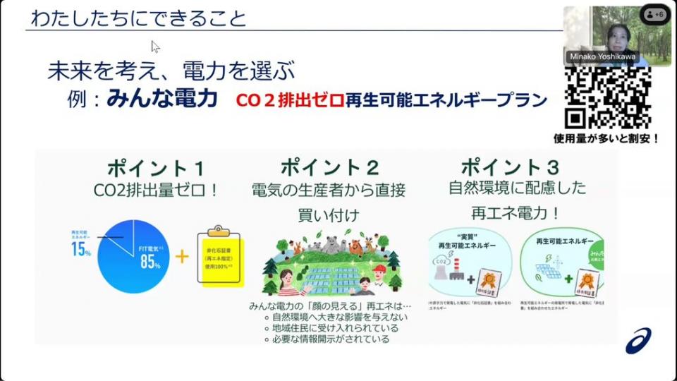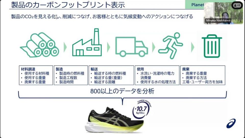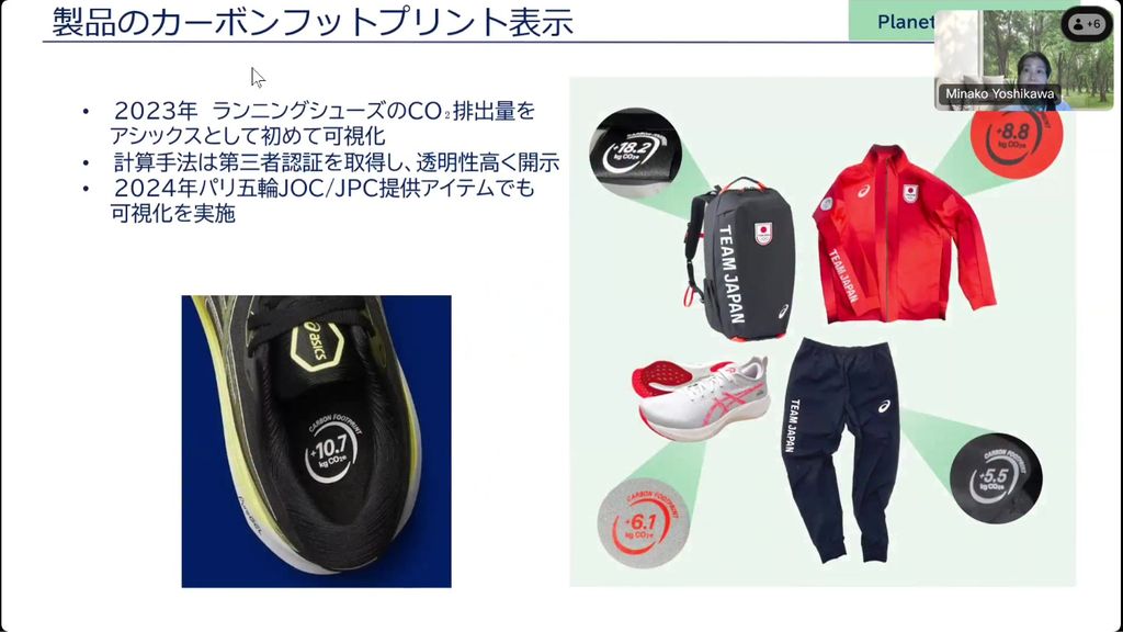 また、アシックスでは特定のシューズで、カーボンフットプリントを表示しています。パリ2024オリンピック・パラリンピック競技大会では、選手のウェアの温室効果ガス排出量を算出し、表示できました。海外では今後、カーボンフットプリントの表示が求められていく方向ですので、今後も続けたいと思います。