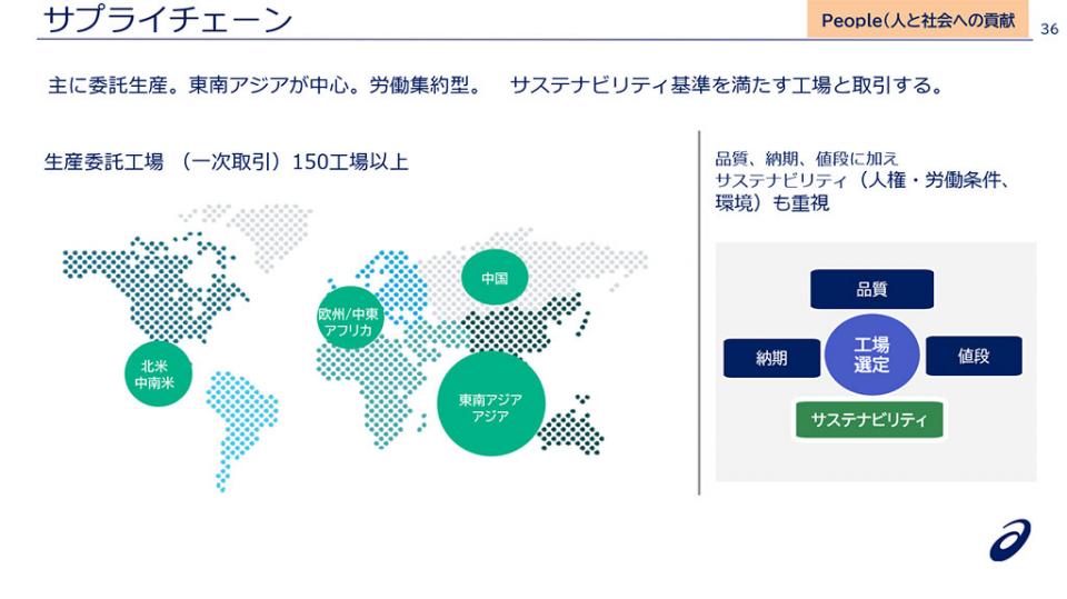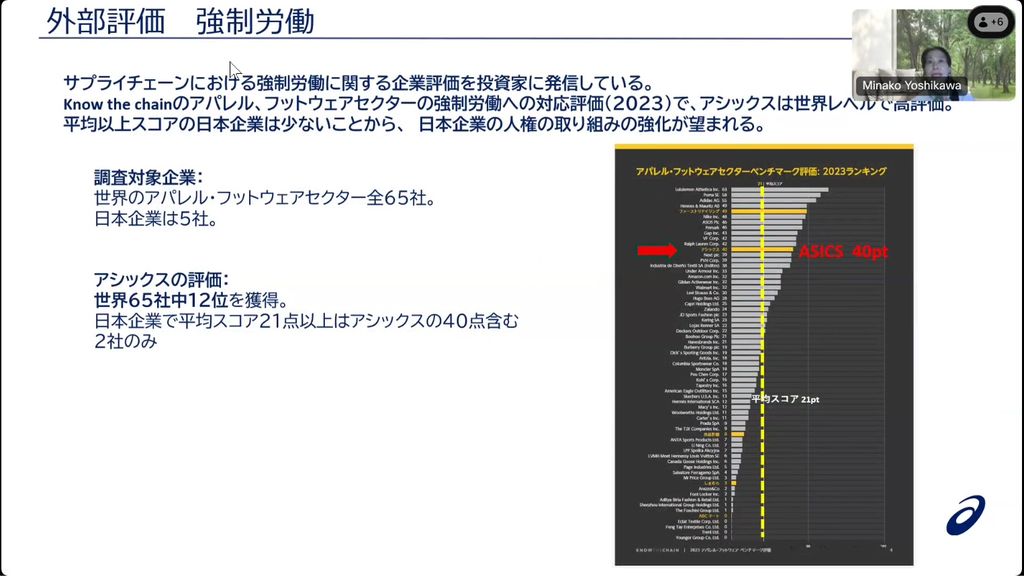 2013年約10年前にバングラデシュで、縫製工場が入るビルが崩壊し、働いていた1,000人以上が亡くなる事故がありました。アシックスもシューズとアパレルの委託生産工場は、東南アジアが中心ですが、生産工場で働く人々の人権尊重を高い優先順位で順守しています。それを物語るのが外部評価です。例えばアシックスは、「強制労働」に特化した「Know the chain」という評価で、世界の平均以上の評価を獲得しています。