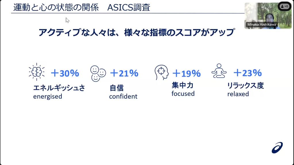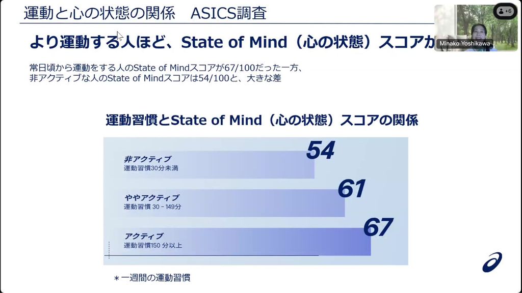 アシックスでは2024年に、日本を含む22カ国、2万6,000人を超える人々を対象として「運動と心はどのように関係があるか」を調べて報告しました。より運動する人ほど「State of Mind(心の状態)」のスコアが高いことがわかっています。また、アクティブな人はエネルギッシュさや集中力、リラックス度など、いろいろな指標のスコアも高い結果が出ています。