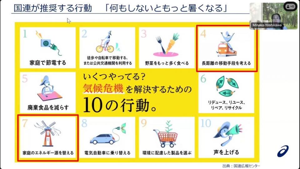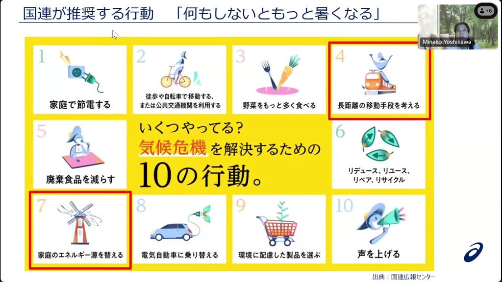 また、私たちはスポーツを通じて人々を健康にする企業なので、気候変動がスポーツに与える影響をとても心配しています。イギリスBBCやその他のメディアの予測によると、このまま温暖化が進むと、例えばサッカーならば試合時間を短縮する、選手が体力を消耗しないよう、40人が自由に交代する、大きな世界大会に出るチーム数を減らして、選手の移動に伴うCO₂排出量を減らすといったことが起こるのでは…等と報告されています。