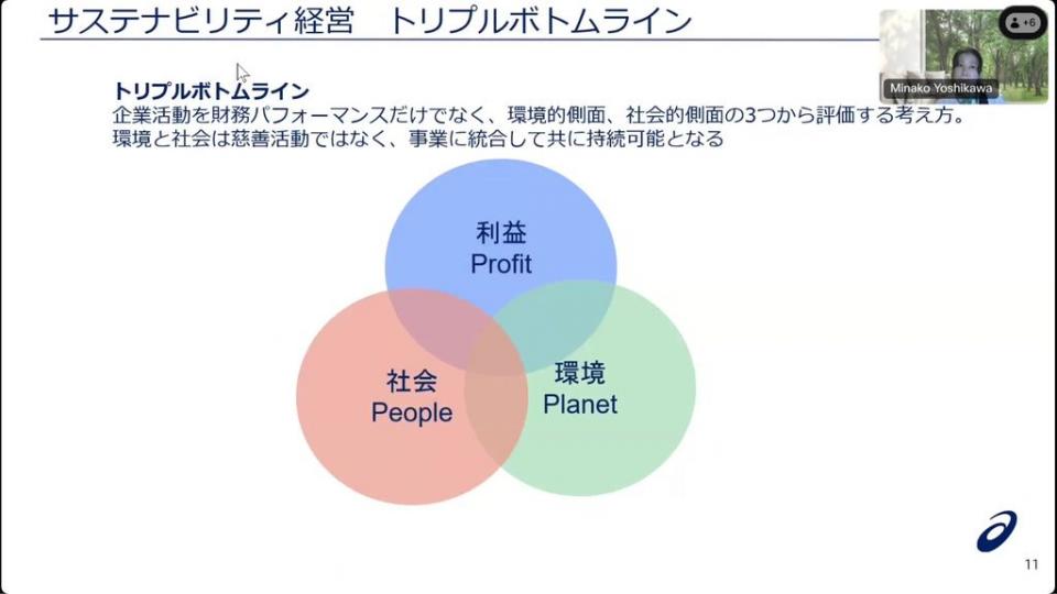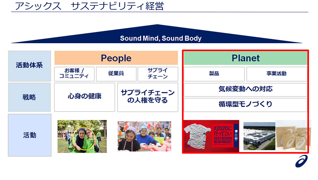アシックスのサステナビリティ経営は、創業哲学である「健全な身体に健全な精神があれかし(Anima Sana In Corpore Sano)」を表すブランド・スローガン「Sound Mind, Sound Body」を使命とし、環境への配慮に関しては循環型ビジネスへの転換を通じて気候変動対策に取り組むこと、人と社会への貢献に関してはサプライチェーンの人権を守ることを主な戦略としています。