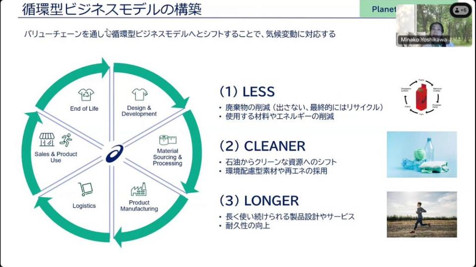 アシックスはスポーツができる環境を守るために、温室効果ガス排出量を実質ゼロにする、気温上昇を1.5℃未満に抑えることを目指しています。また、温室効果ガスを削減するため、モノづくりにおけるLESS、CLEANER、LONGERの3施策を大切にしています。LESSは使用する資源や、廃棄物をできるだけ少なくする。最終的にはリサイクルする。また、使用する材料やエネルギーも削減していく。CLEANERは石油からクリーンな資源へのシフト。LONGERはできるだけお客様に長く使い続けていただける、耐久性の高い製品をお届けすることです。
