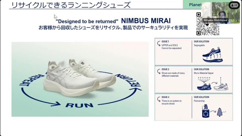 一般的に、履き終わったシューズは素材の分離が難しいので、ほぼ焼却か埋め立て処分されています。アシックスは廃棄せずに、これを次の製品の何らかの材料としてリサイクルし、循環型にしていきたいと考えました。それを実現したのが「NIMBUS MIRAI™」で、最大の特徴はアシックスが初めて、アッパー部分をリサイクルポリエステルの単一素材にしたことです。ソールはまだ複数素材ですが、熱を加えたときに簡単にはがせる特殊な接着剤(グルー)を開発しました。また、靴ベロに付けたQRコードを読み込むと、使用後に回収の申し込みが簡単にできます。