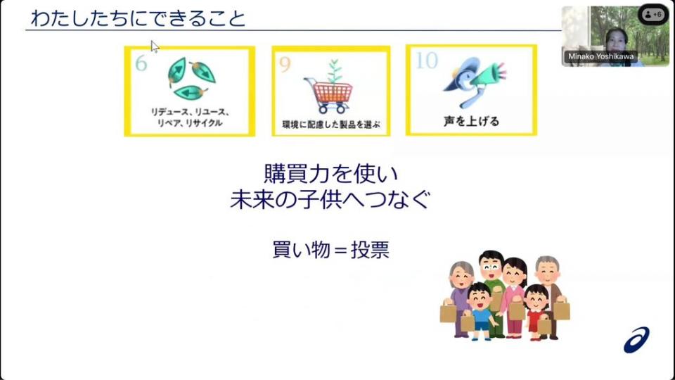 知らないうちに問題の加担者になっている場合もあるので「私の使っている製品は大丈夫か」と自らに問いかけて欲しいです。課題の原因の一つになるか、解決方法の一つになるかは皆さんのアンテナの張り次第、日々の行動次第だと思いますので、私も解決の一つになる生活を送り、未来の子どもたちに地球をしっかりとつないでいきたいと思います。