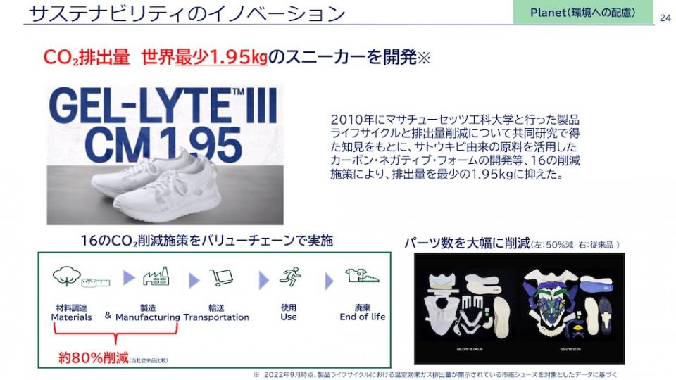 この原則にのっとって実現したイノベーションの一つが、1足あたりのCO₂の排出量が1.95kg CO₂eと、世界最少のスニーカー「GEL-LYTE™ Ⅲ CM 1.95」を開発したことです。これは、アシックスの同カテゴリーの平均的な排出量の約4分の1以下です。パーツの多いシューズは、工程も使われる電力も多く、排出量を減らしにくいのですが、材料メーカーや工場と一緒に、安全性や機能性も確保しました。 (*2022 年 8 月にISO14067 規格に準拠してアシックスが実施し、SGS (Société Générale de Surveillance) Japan によって検証された計算に基づいています。)