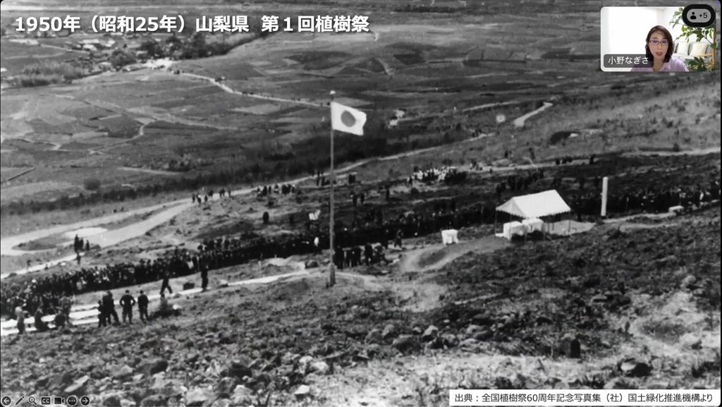 75年前(1950年)に甲府市で、第1回全国植樹祭が行われました。そのころの日本の森は、軍事用品物資や復興のために多くの木を伐採し、荒れ地になっていました。そこで国は木々を植え始めたのです。植えた苗木が立派な木になるのに、最低で50~60年かかります。その結果として今、日本の森はOECD加盟国の中で、国土における森林の割合(森林率)が第3位と、かつてないほど豊富な状態です。