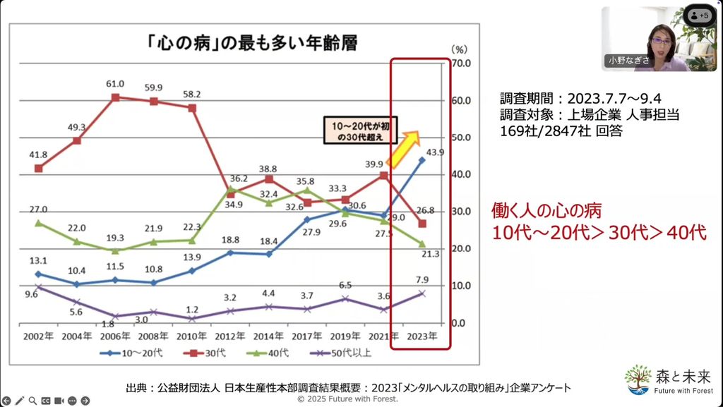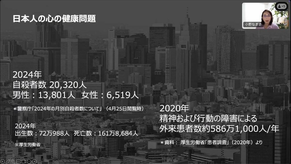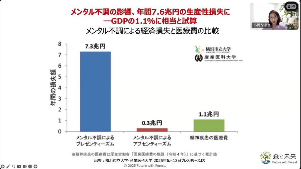 現在の日本では、高齢化が進み、1年間に亡くなる方3人に対して生まれるのは1〜2名のペースで人口が減少しています。一方で、2024年には年間2万人以上が自ら命を絶っており、ここ数年、働く人の10~20代で心の病が増えているというデータもあります。さらに、2025年6月に横浜市立大学と産業医科大学が発表したデータでは、出勤していてもパフォーマンスが発揮できていない「プレゼンティーズム」状態で働いている方々が仕事を続けることで、日本全体で年間およそ7.6兆円(GDPの1.1%に相当)の経済的な損失が生じていることが明らかになりました。